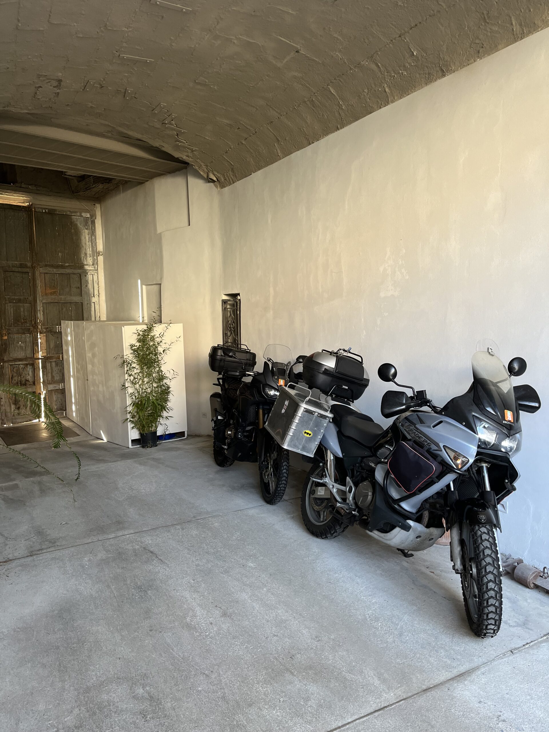 unsere Motorräder durften heute im Hotel im sicheren Schatten verweilen. Die immer noch ursprüngliche Eingangstür lässt nicht auf das Hotel dahinter schließen…