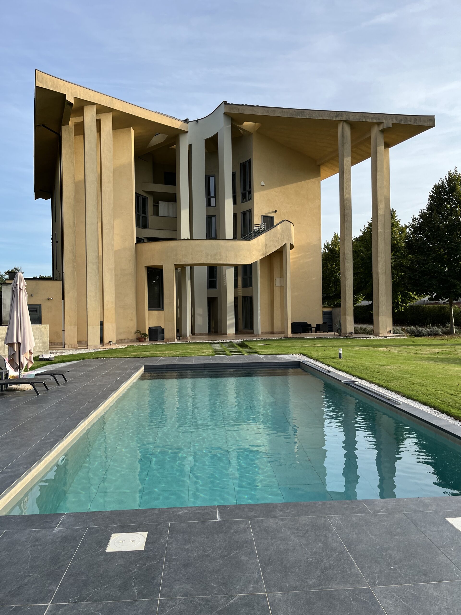 Wir haben wieder einmal Glück mit dem Hotel bzw. ist es ein Einfamilienhaus mit Einliegerwohnung 🤩 Vom Pool der Blick hoch zur Abtei.