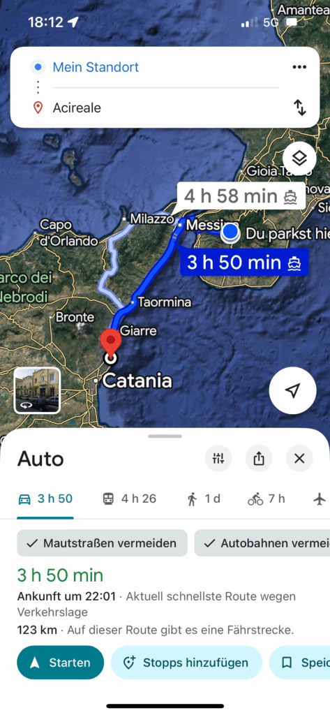Die Vegetation ist üppig und schön. Wir warten an erster Stelle auf die Fähre Und los geht’s. Die kürzeste Entfernung zwischen Sizilien und dem Stiefel sieht aus wie ein Katzensprung. Hier soll auch eine Brücke gebaut werden…