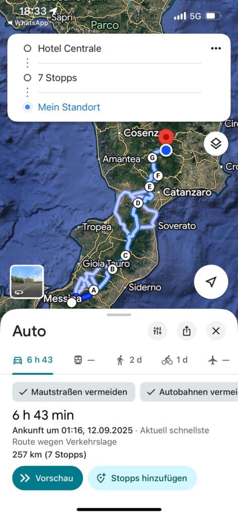 Auch Pauls Motorrad hatte eine schöne Unterkunft im Hotel Centrale. Die Natur überwältigt uns. Sizilien und Kalabrien ist uns als trockenes, karges und heißes Land bekannt. Heiß ist es, ja. Aber der Rest? Üppige Vegetation fast überall. Insbesondere Kalabrien üppiger und grüner und überhaupt als der Schwarzwald. Seht selber.