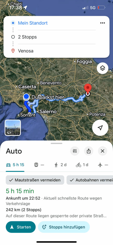 Zum Frühstück hat uns der Wirt im Weingut eine Karaffe mit rotem Inhalt hingestellt und als Fühstückswein deklariert. War natürlich Traubensaft, hat mich aber so gaga gemacht, dass ich meine Badehose habe hängen lassen. Die passt dort keinem🤣 Musti meint, die gefällt dort keinem🤔 Die Fahrt hier rüber Richtung Neapel war nicht der Reisser. Die […]
